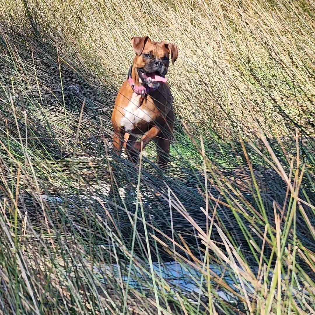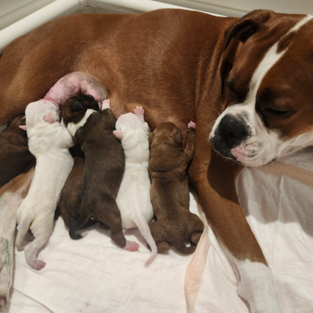 This was Zoe and Jake’s first litter. Born on January 11, 2024. There were 4 girls and 3 boys, 2 white pups and 5 fawn pups all with white markings. They have all gone to their forever homes and keep in touch with us often.